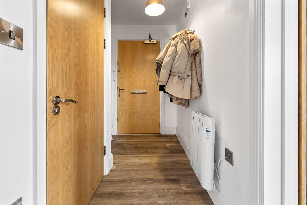 ENTRANCE HALL Entered via wooden door, with security spy hole. Wood effect laminate flooring. Wall mounted electric panel heater. Large storage cupboard, housing hot water tank. Wall mounted security intercom system.