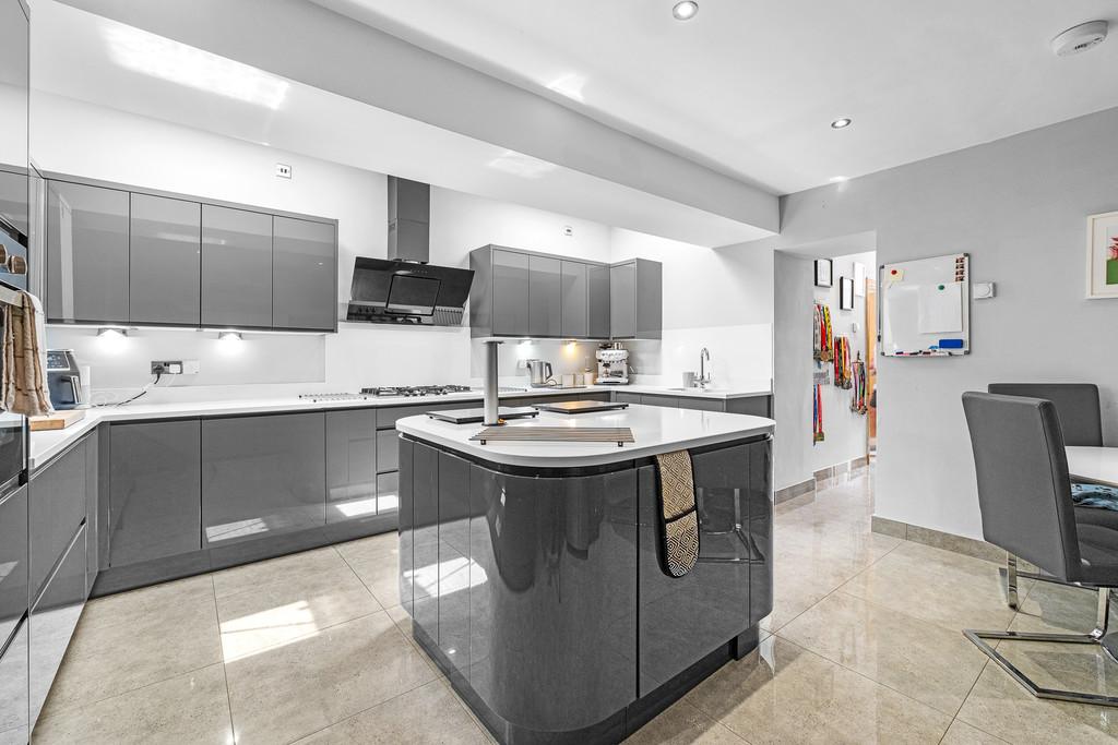 KITCHEN/DINER 16' 3" x 14' 10" (4.96m x 4.54m) Modern fitted 'Wren' kitchen with a range of wall, base and drawer units with worktops over incorporating gas hob with extractor above and inset 1.5 sink with hot and cold tap over. Integrated dishwasher, fridge and two ovens. Space for large fridge/freezer. Central island with worktops over and ample storage beneath. Tiled flooring with underfloor heating. Spotlights. Under counter lighting. Two skylights with rain sensors. Power points. Space for dining table and chairs. Opening to hallway leading to family room, utility room and downstairs shower room.