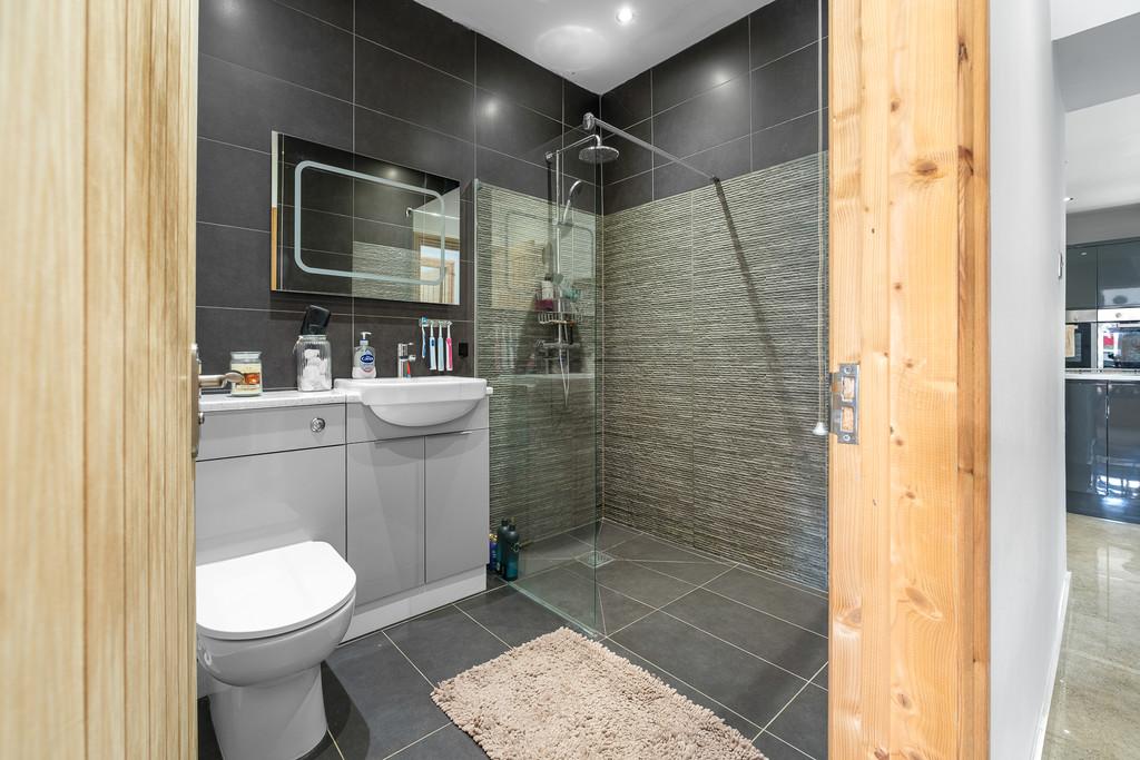 SHOWER ROOM Tiled flooring with underfloor heating. Tiled walls. WC. Vanity wash hand basin with mixer tap above and storage beneath. Wall mounted LED light mirror. Spotlights. Walk in double shower cubicle with mains powered shower over. Extractor.