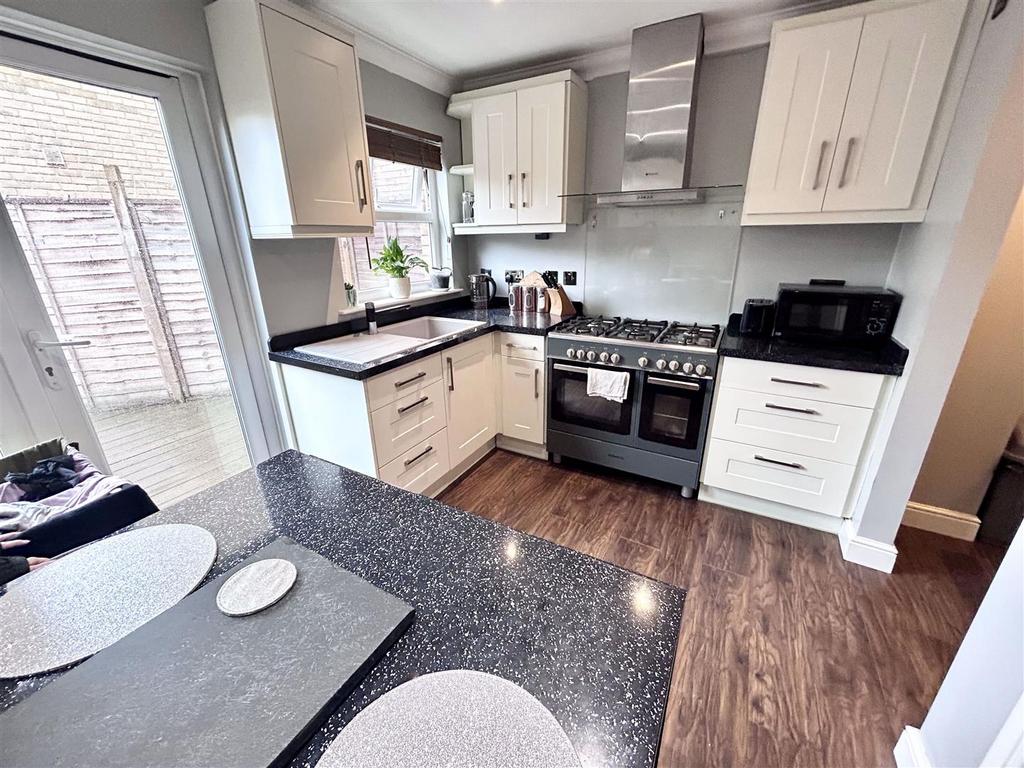 Kitchen - 14' 5'' x 11' 9'' (4.40m x 3.57m) - Wood Effect Laminate flooring. Modern-fitted kitchen with breakfast bar, sink drainer and dual gas ranger cooker. Utility space for white goods. Double glazed window to rear aspect. Double glazed French doors leading to decking area.