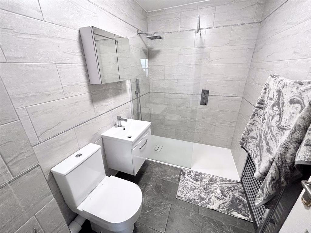 Shower Room - 6' 0'' x 5' 6'' (1.83m x 1.67m) - Tiled flooring. Modern-fitted walk-in shower with sink basin and WC. Heated towel rail.