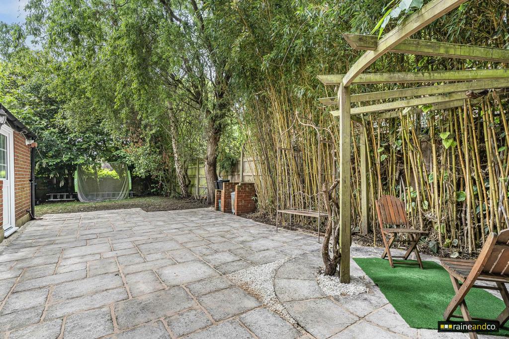 lawn area with mature trees and shrubs, not overlooked, outside tap, patio, garden shed, security light, gated side access to large plot offering extension potential (STPP).