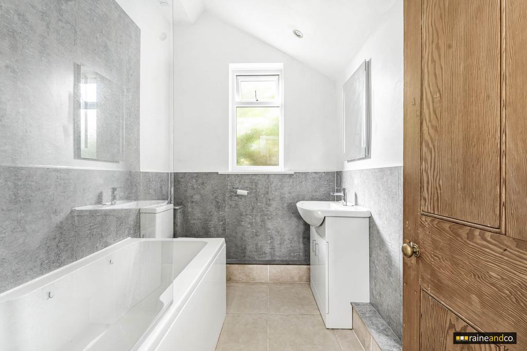 Double glazed opaque window, WC, wash hand basin with vanity unit, panel-enclosed bath with mixer tap and plumbed shower over, extractor fan, tiled flooring, partly tiled walls, inset spotlights (renovated 2023).