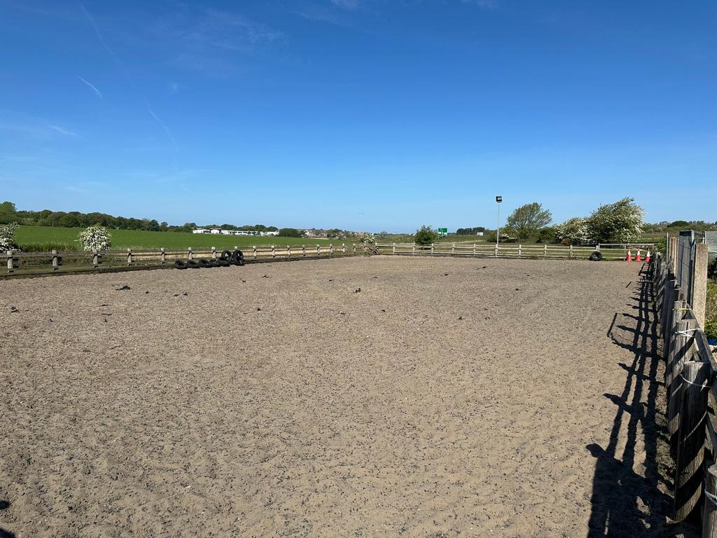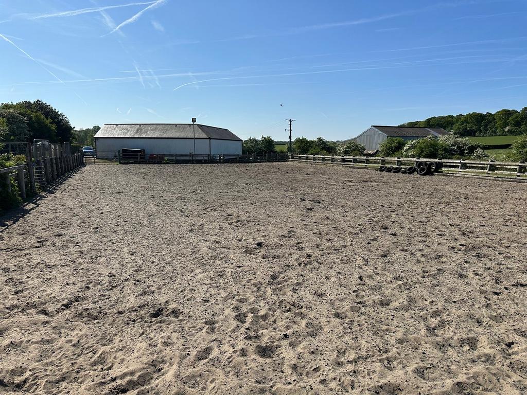 40m x 22m (131' 3" x 72' 2") The property includes an outdoor manège with a sand base, surrounded by a wooden post and rail fence.