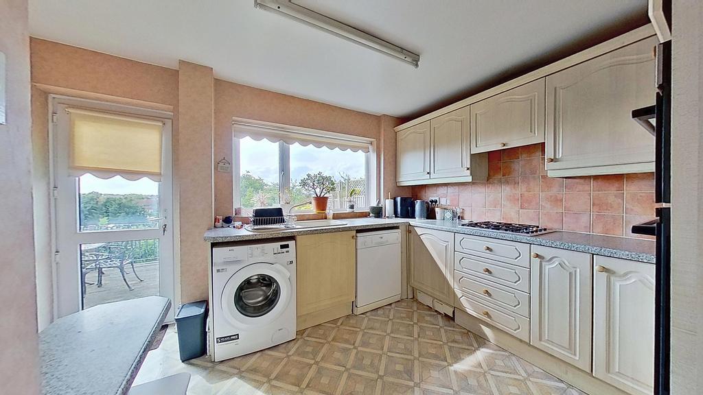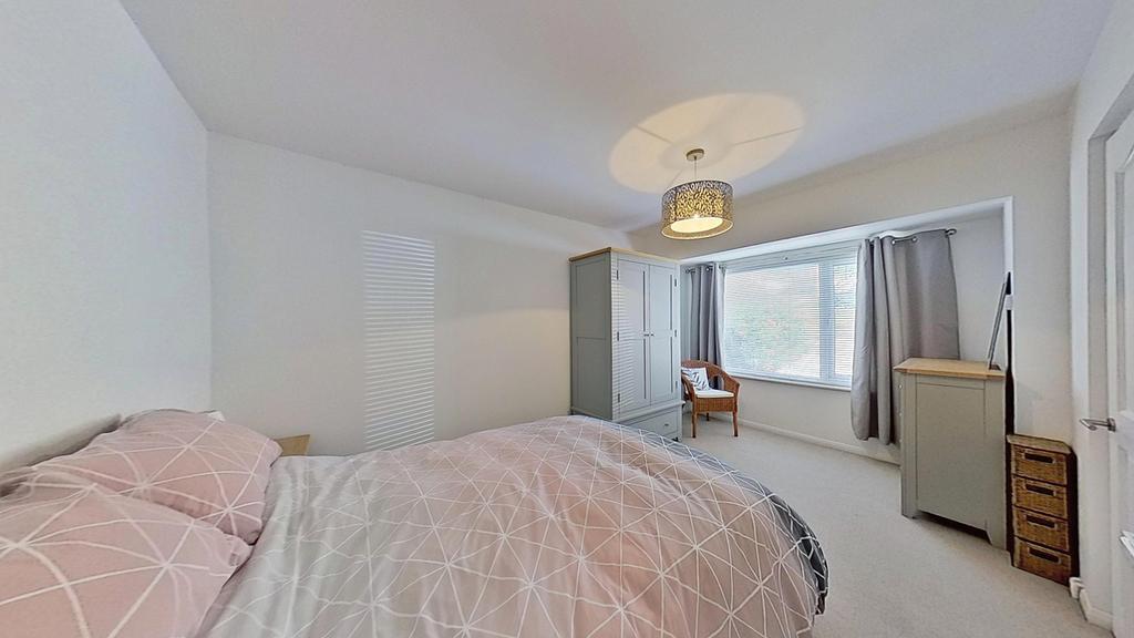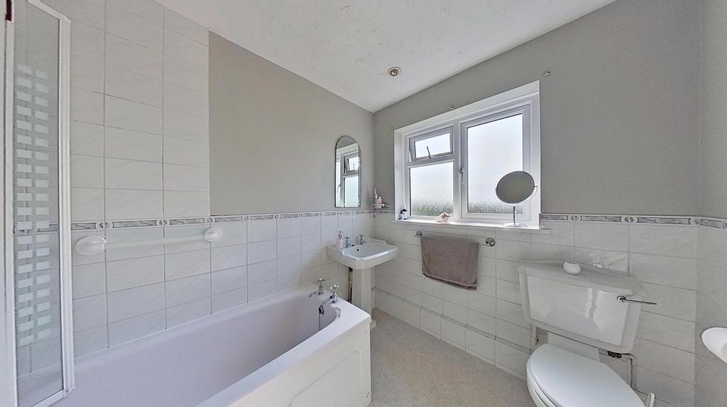 On the upper floor, there are two further bedrooms along with a modern family bathroom, providing comfortable accommodation for a growing family or visiting guests. Outside, there are established gardens at both the front and rear, while a driveway at the side leads to a garage, offering off-road parking and storage.
