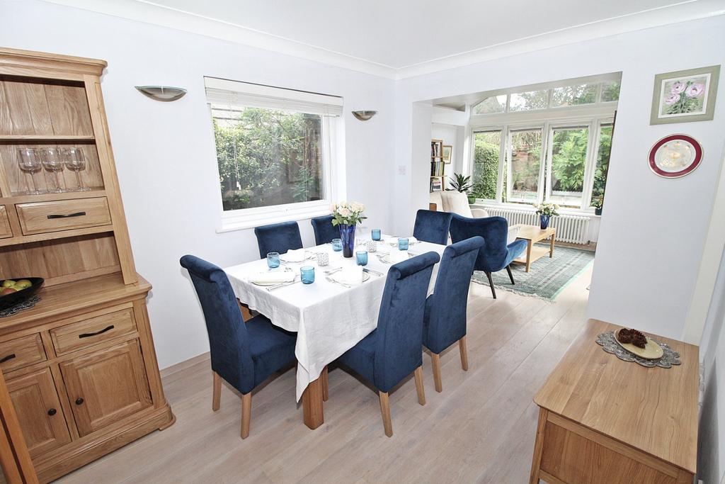 Offering generous and flexible accommodation throughout, the ground floor features a stunning 20ft dual-aspect living room complete with a contemporary remote-controlled feature fireplace and stylish bi-folding doors, seamlessly connecting to the adjoining dining room - ideal for both entertaining and family gatherings. The dining room flows into a striking garden room, boasting a high ceiling, integrated speakers, and ambient mood lighting, providing the perfect setting to relax or host guests.