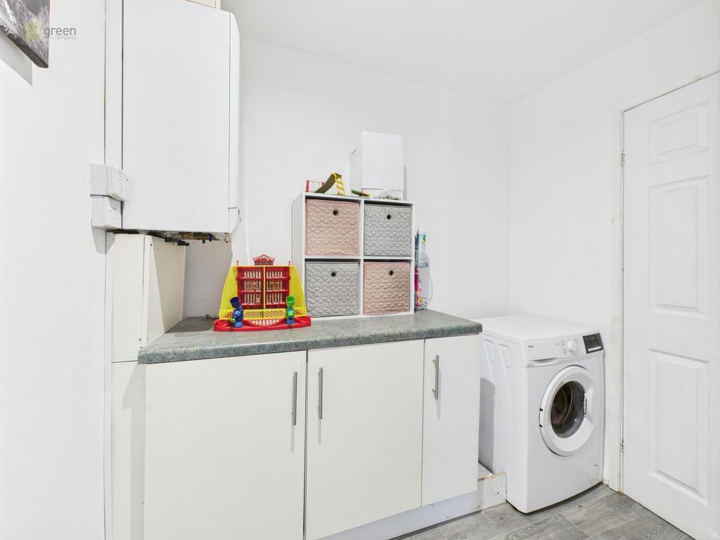 UTILITY ROOM 7' 8" x 7' 3" (2.34m x 2.21m) Having a range of wall and base units, work surfaces, plumbing for washing machine, door leading to:-
