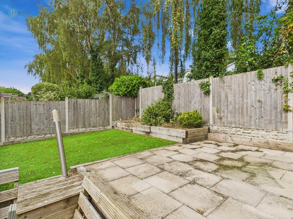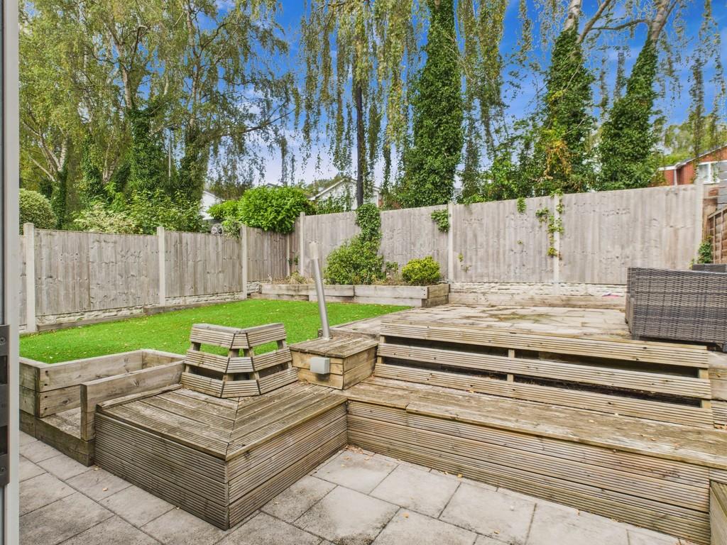 REAR GARDEN Landscaped, patio area, seating area and lawn, enclosed by fences.