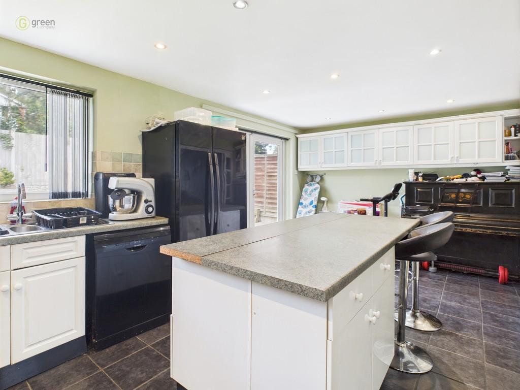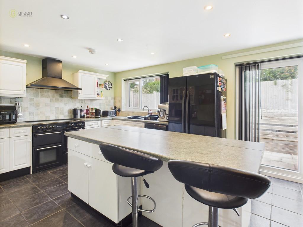 OPEN PLAN KITCHEN 11' 2" x 19' 9" (3.4m x 6.02m) Having centre island with breakfast bar, space for American style fridge/freezer, range cooker with extractor over, wall and base units and work surfaces, sink with mixer tap, double glazed windows to rear and sliding doors leading out to the garden.