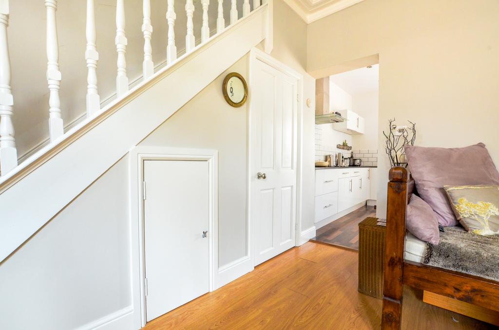 Double glazed uPvc door leading into the living room. The living room is a beautifully presented light and airy room, with an abundance of natural light from the large bay window to the front. The room features double glazing to the bay, feature fireplace, moulded coving, radiator, stairs to the first floor, laid to laminate flooring, under stairs storage cupboard and door to the following: