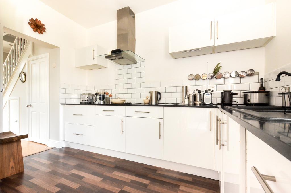 Continuation of the laminate flooring, work surface with tiled splash back and wall mounted unit, space and plumbing for washing machine, unit with inset stainless steel sink.