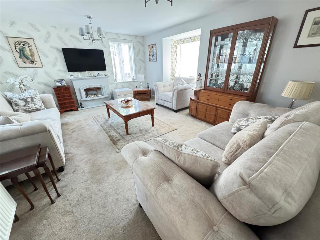 Lounge - 5.18m x 4.37m (17' x 14'4) - Double glazed bay window to side with further window to side, French doors & glazed panels leading to Orangery, feature fireplace, radiator, power & Tv points, telephone point.