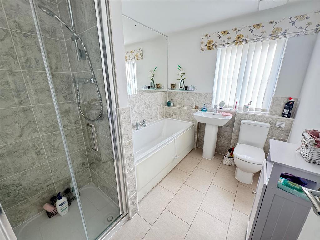 Family Bathroom - UPVC double glazed window to front, white suite comprising, panelled bath, separate shower cubicle, low level wc, pedestal wash hand basin, splash back tiling & complimentary tiled floor, heated towel rail.