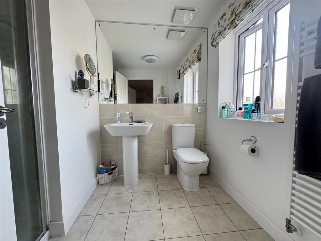 En-Suite Shower Room - UPVC double glazed window to rear, modern white suite with oversized shower with glazed sliding doors, pedestal wash hand basin, low level wc, splash back tiling, shaver point, extractor fan, tiled floor, heated towel rail.