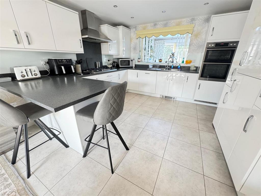 Kitchen/Breakfast Room - 6.50m x 3.66m (21'4 x 12') - Double aspect room with UPVC double glazed bay window to front & further window to side, fitted with a modern and contemporary style range of white eye level & base level units with complimentary rolled edge worktops incorporating breakfast bar, inset sink drainer, six ring gas hob with extractor fan, glass splashbacks, worktop lighting, tiled floor, wine rack, integrated dishwasher, power points, tv point.