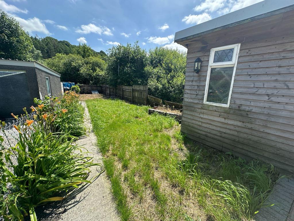 Side double gates leading to enclosed parking, paved driveway, children's playhouse and garden shed with electricity, enclosed garden laid to lawn.