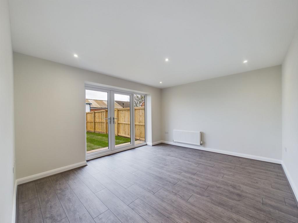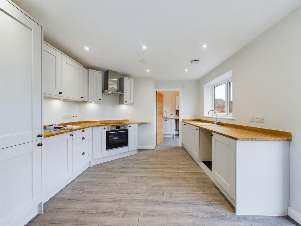 complementary work surfaces. Complete with integrated appliances, creating a sleek and modern look; oven, 4 ring hob, chimney style extractor hood, ceramic sink and drainer with chrome mixer taps. Space for fridge freezer and plumbed for dishwasher. Ceiling spotlights, double glazed window to the rear.