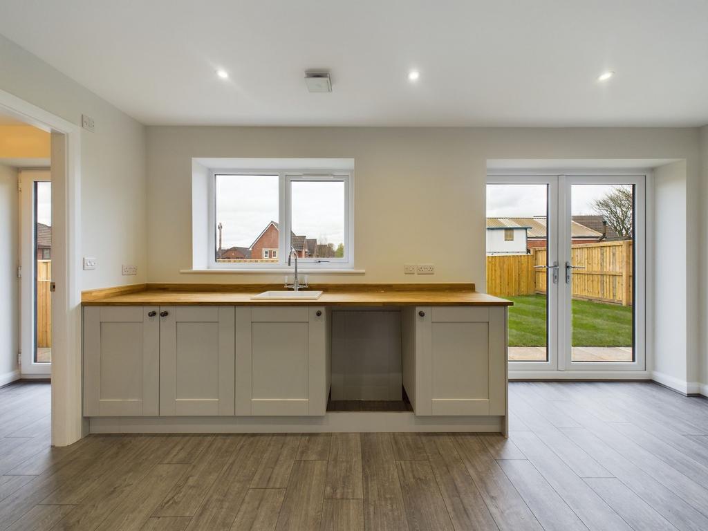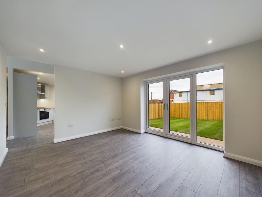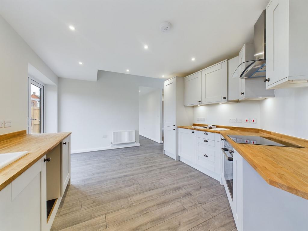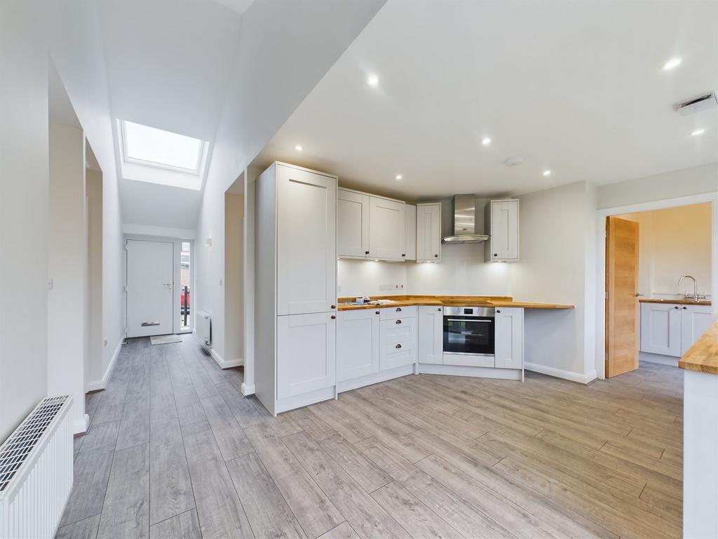 Light and spacious open plan kitchen/diner with space for dining and French doors opening into the garden. The modern fully fitted kitchen is offered with a choice of kitchen styles, a range of wall and base units with