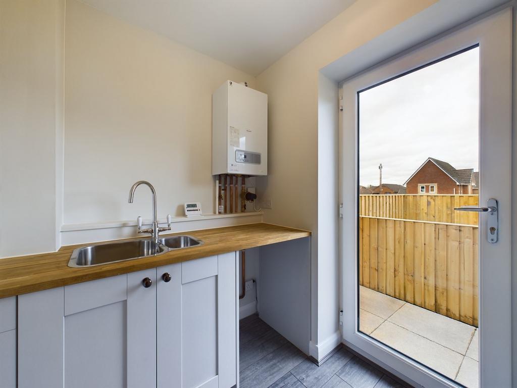 Utility room provides base unit cupboards with complementary work surfaces and a stainless steel sink. Plumbed for washing machine. External door to rear of garden.