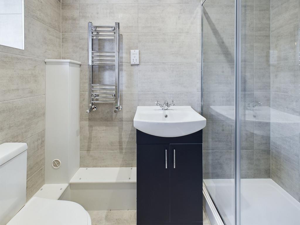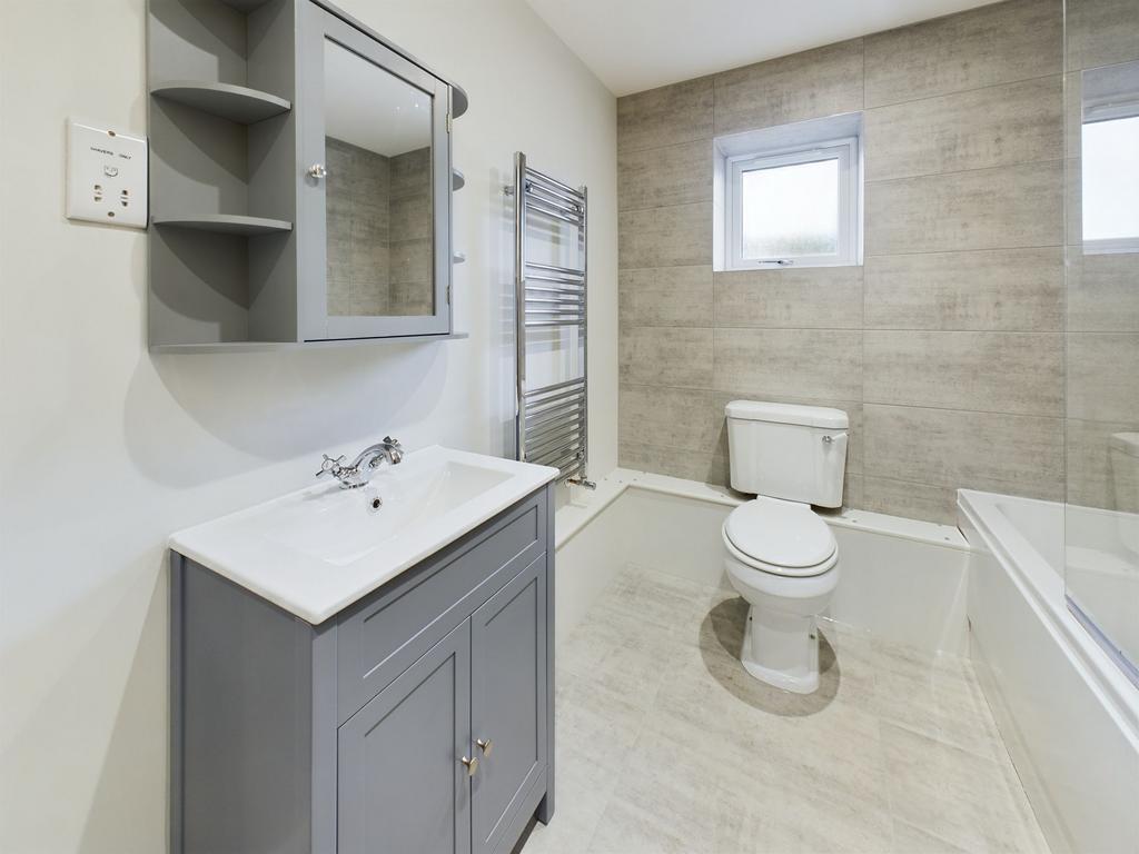 Beautiful three piece suite comprising of: low level WC, wash basin inset in vanity unit and chrome mixer taps. Shower cubicle. Chrome heated towel warmer. Shaving point. Tiled wall and flooring with choice of tiling available.