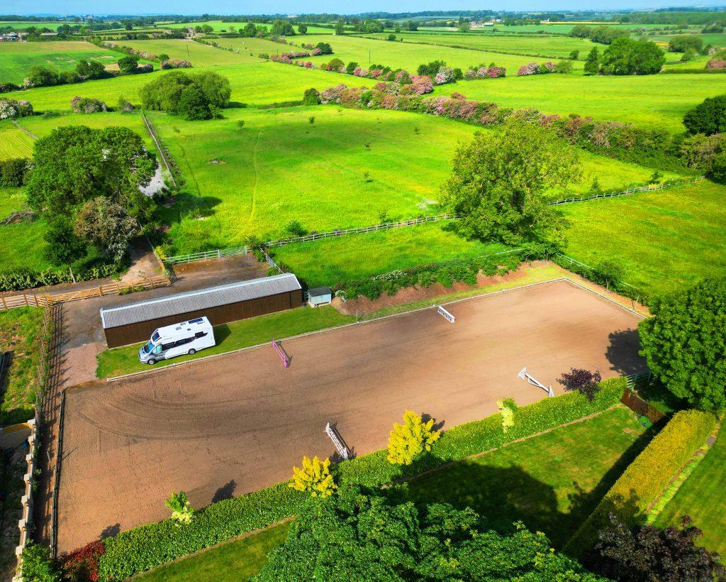 Outside, the property benefits from a large detached double garage and generous mature landscaped gardens stocked with rare trees, shrubs and roses. Beyond lies a high-quality equestrian setup, including a secure yard with four modern stables, feed/tack room, standing for horseboxes and trailers, and a 60m x 20m all-weather dressage arena complete with a sprinkler irrigation system.