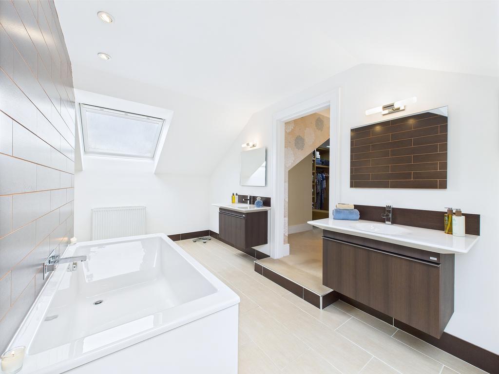 Designed for comfort and luxury, the home includes three beautifully finished modern bedrooms at the front of the property, with built-in wardrobes and one being en-suite. The fifth bedroom offers flexibility as a bedroom, games room, home office or potential as a self-contained annex. The showpiece is the master suite – a serene and spacious room with its own private sitting area, a walk-in wardrobe/dressing room, and a luxurious four-piece en-suite bathroom, benefiting from “roca” sanitaryware and high level Velux windows which allow natural daylight.