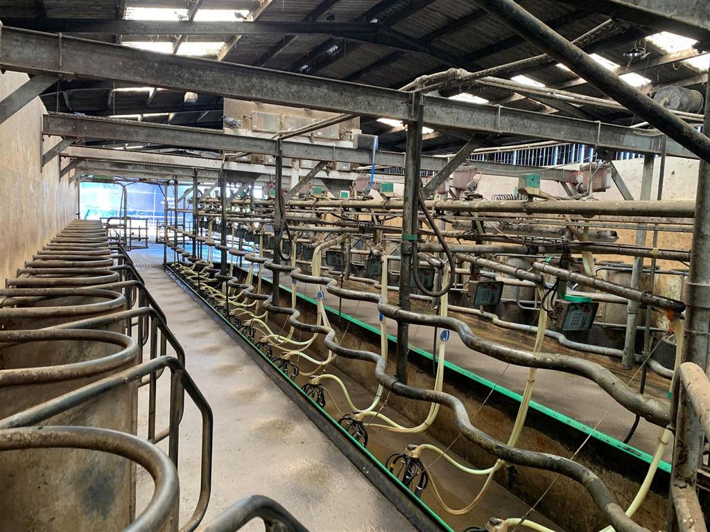Parlour 16 x 32 swing over herringbone parlour with auto ID feed hopper unit for each cow place. Collecting yard.