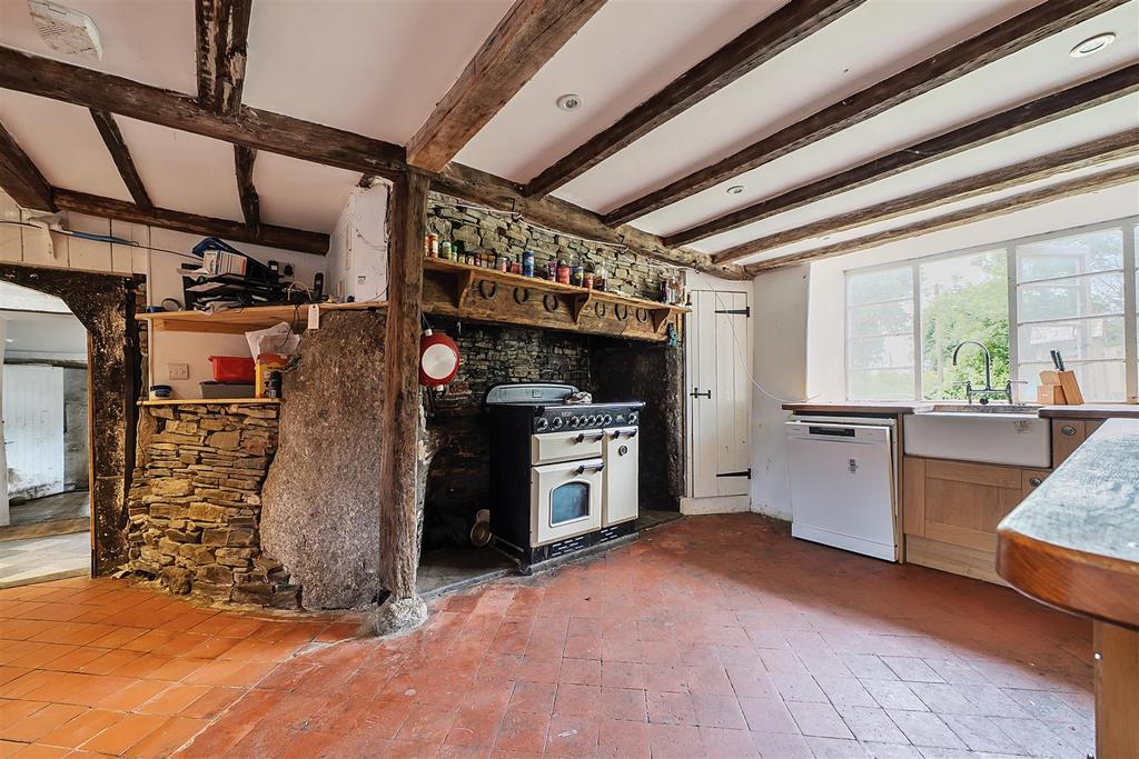 Kitchen/Breakfast Room with red quarry tile floor, timber kitchen units, large character inglenook with electric range cooker, exposed ceiling timbers, built-in storage cupboards and pleasant outlook to the rear garden.