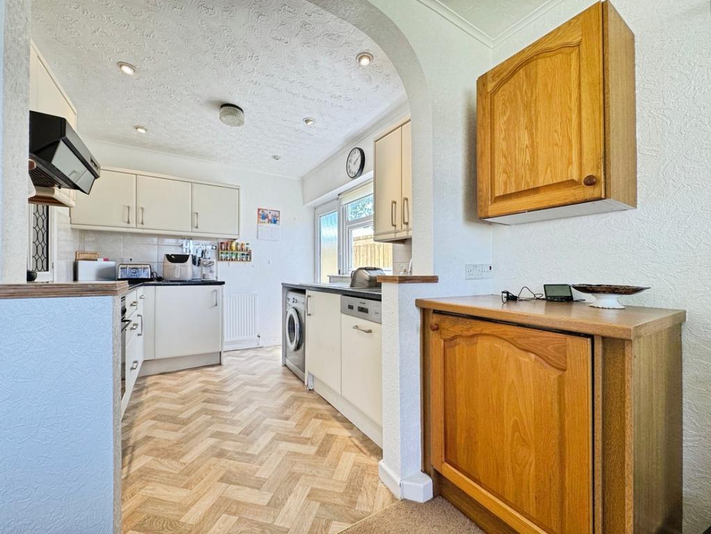 Fitted with a range of matching wall and base units with work surface over, stainless steel sink with mixer tap, integrated oven and hob with extractor over, integrated “Montpellier” dishwasher, space for freestanding washing machine, tiled splashback, vinyl style flooring, radiator, uPVC double glazed window and door to side elevation.