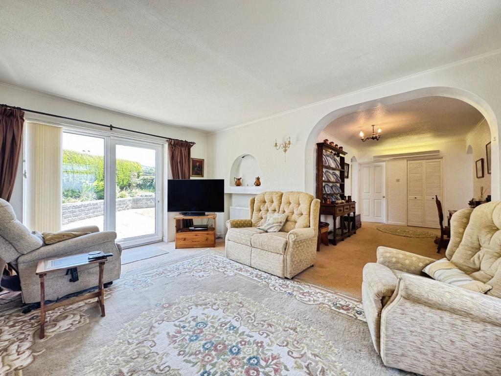 Carpeted underfoot, radiator x2, uPVC double glazed window to front elevation, uPVC double glazed sliding doors to rear elevation, feature fireplace with tiled hearth.