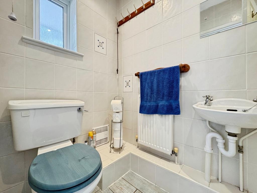 Fitted with a white three piece suite comprising of W/C, wall mounted wash hand basin, shower cubicle, fully tiled floor and walls, radiator, extractor fan, uPVC double glazed frosted window to front elevation.