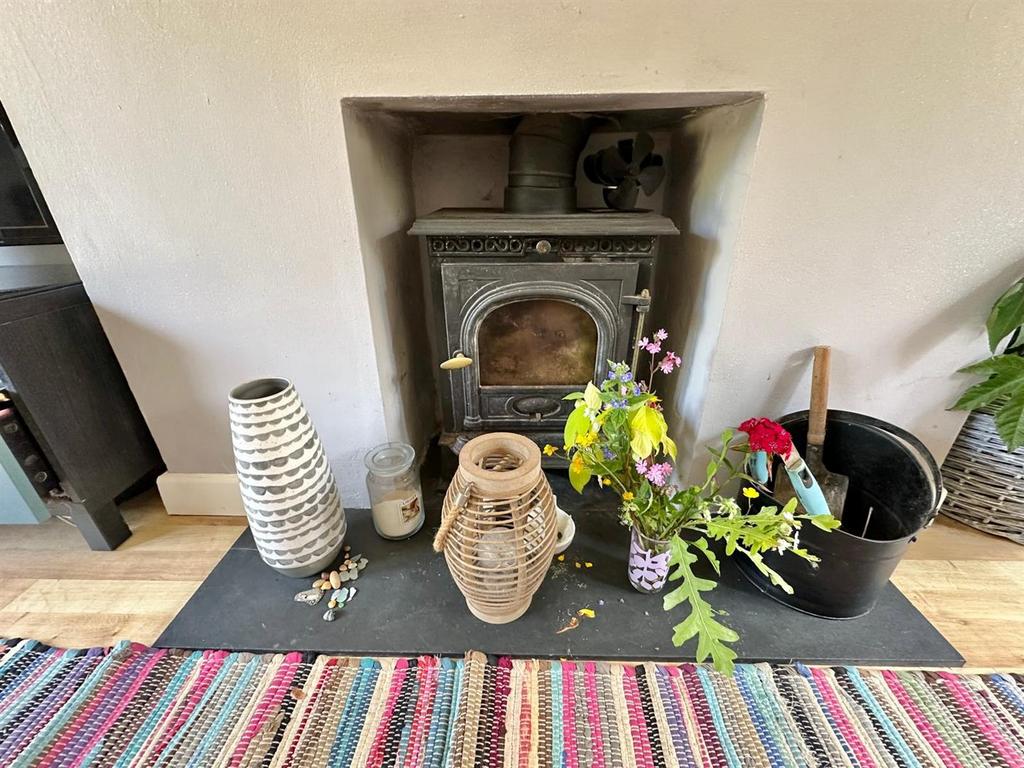 - Living room with log burner and doors to the garden