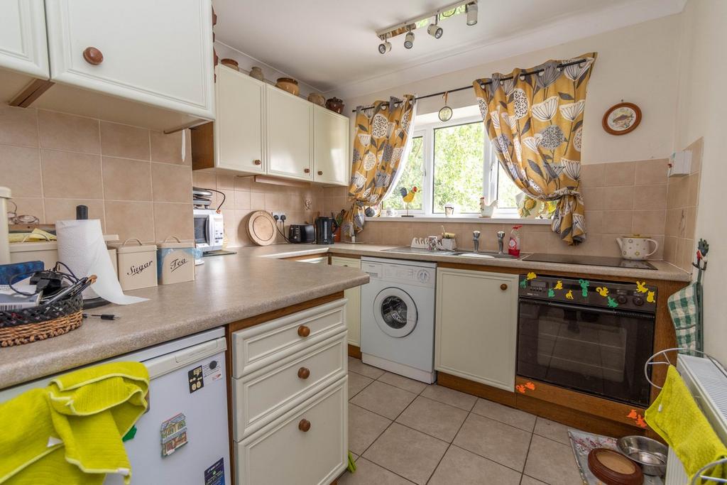A range of fitted off white base and wall units with laminate worktops incorporating a stainless steel sink unit with pillar taps, tiled splashbacks. Integrated oven and ceramic hob, spaces and plumbing for a washing machine and fridge freezer (white goods included in the sale). Radiator, ceramic floor tiles, ceiling spotlights and a window to the front.
