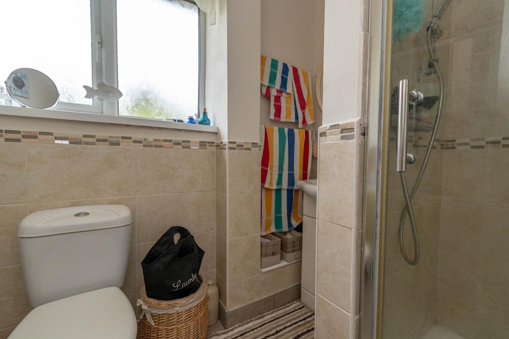 A white suite comprising a shower cubicle with a chrome mixer shower, vanity storage unit incorporating a wash basin, WC. Radiator, electric wall heater, ceramic floor tiles and splashbacks, window to the rear with obscured glass.