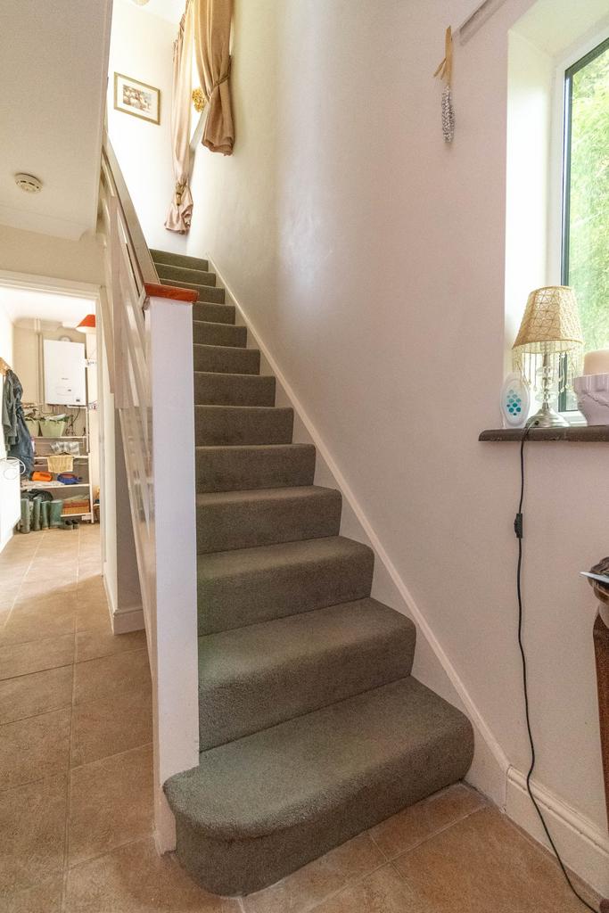 A solid timber door leads from the front of the property into the entrance hall with staircase to the first floor landing . Radiator, ceramic floor tiles, window to the side, coat hooks and a door leading into: