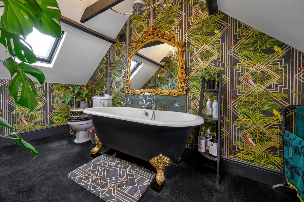 Bathroom - 3.84m x 2.24m (12'7 x 7'4) - Modernised with a traditional style suite comprising free standing ball and claw double ended bath with mixer tap, integrated shower handset and rainwater rose over, close coupled wc, pedestal wash basin, tiled splashbacks, contemporary column radiator, pitched ceiling with exposed timbers, skylight to the rear and double glazed dormer window to the front.