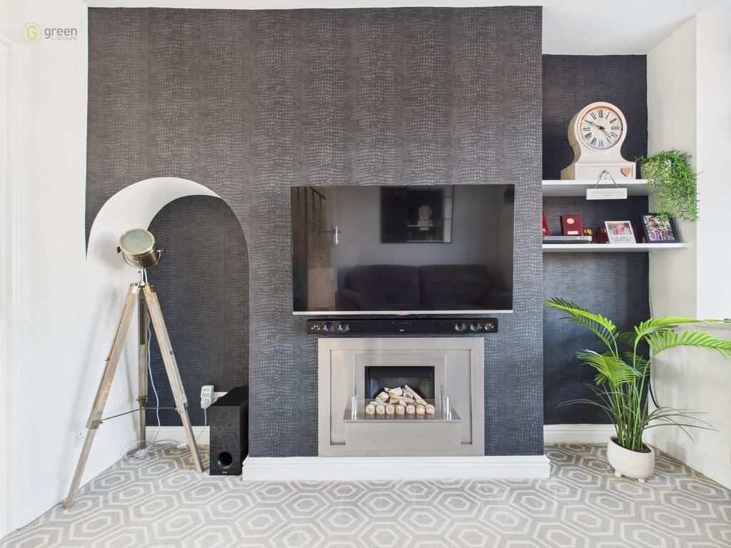 LOUNGE 13' 6" x 9' 9" (4.11m x 2.97m) Is a lovely room with bay window to front, blinds, gas feature fire, radiator and feature wall covering.