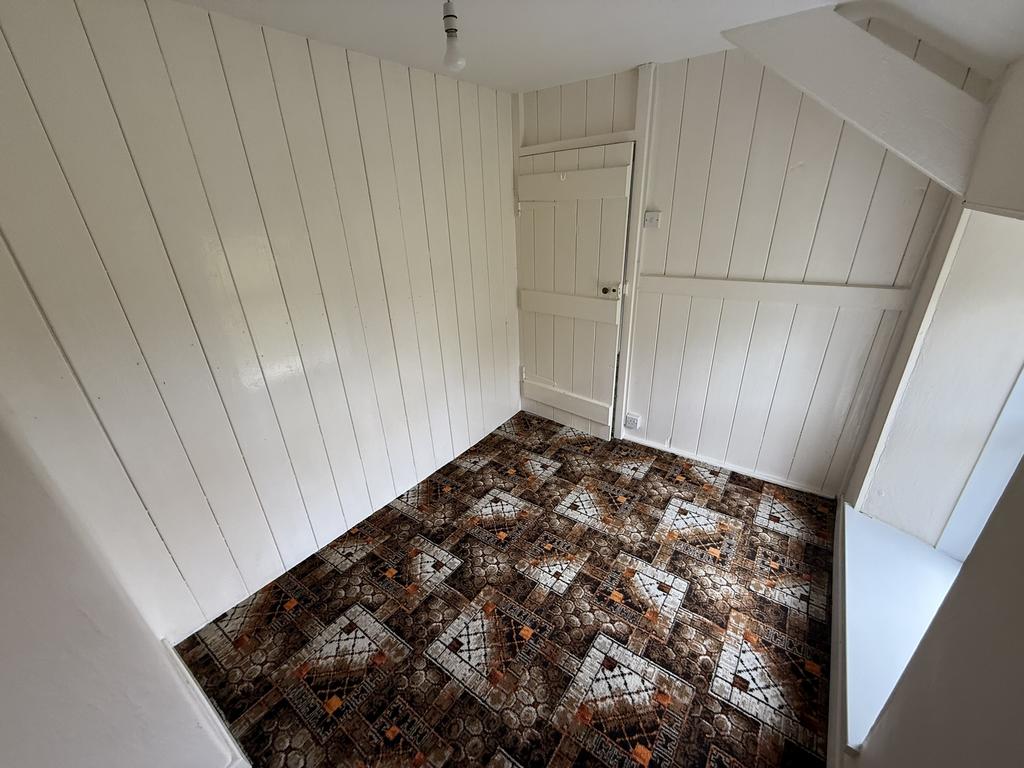 Low level flush WC pedestal wash hand basin, double glazed window to rear, tiled walls, glazed and tiled shower cubical with ‘Triton’ electric shower and shelved airing cupboard.