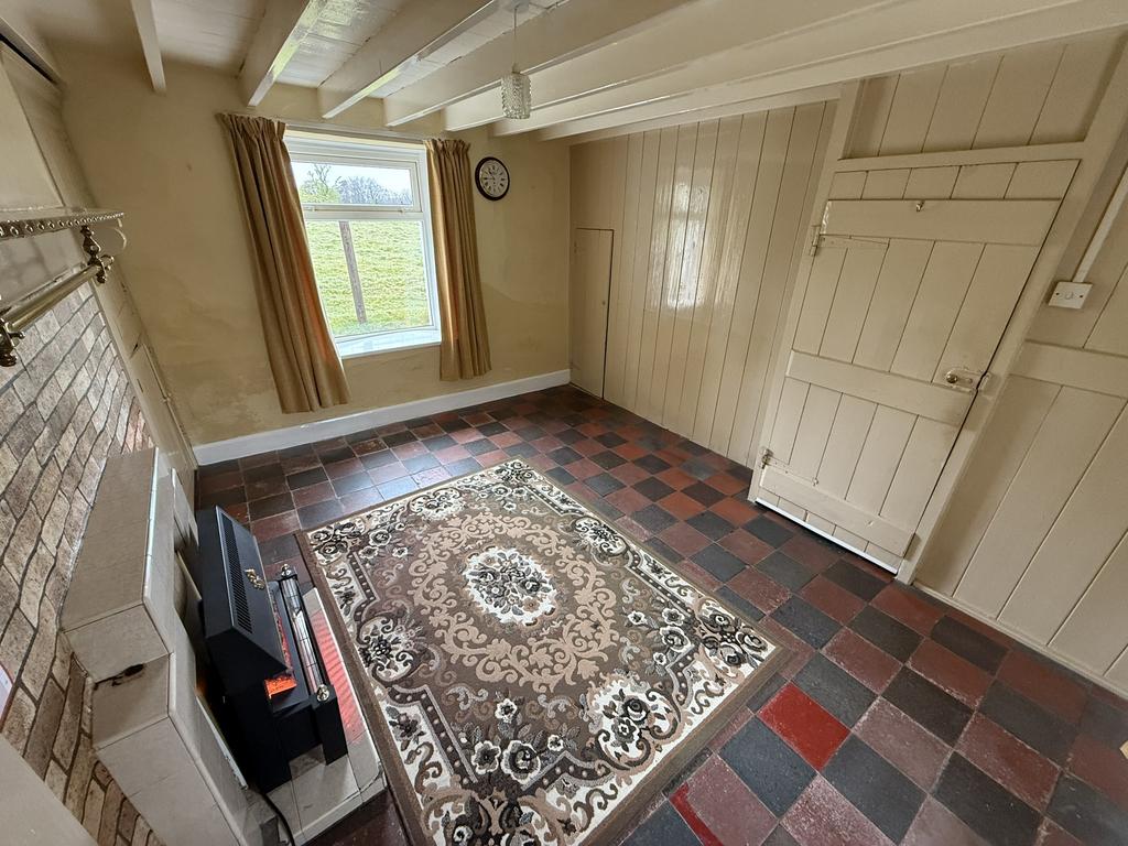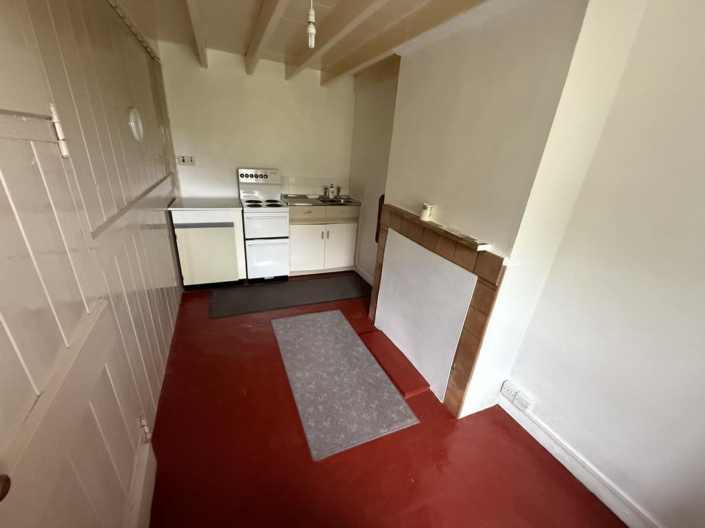 Double glazed window to front tiled open fireplace, base units incorporating single bowl and drainer sink unit, free standing ‘Tricity’ electric oven, open beam ceiling.
