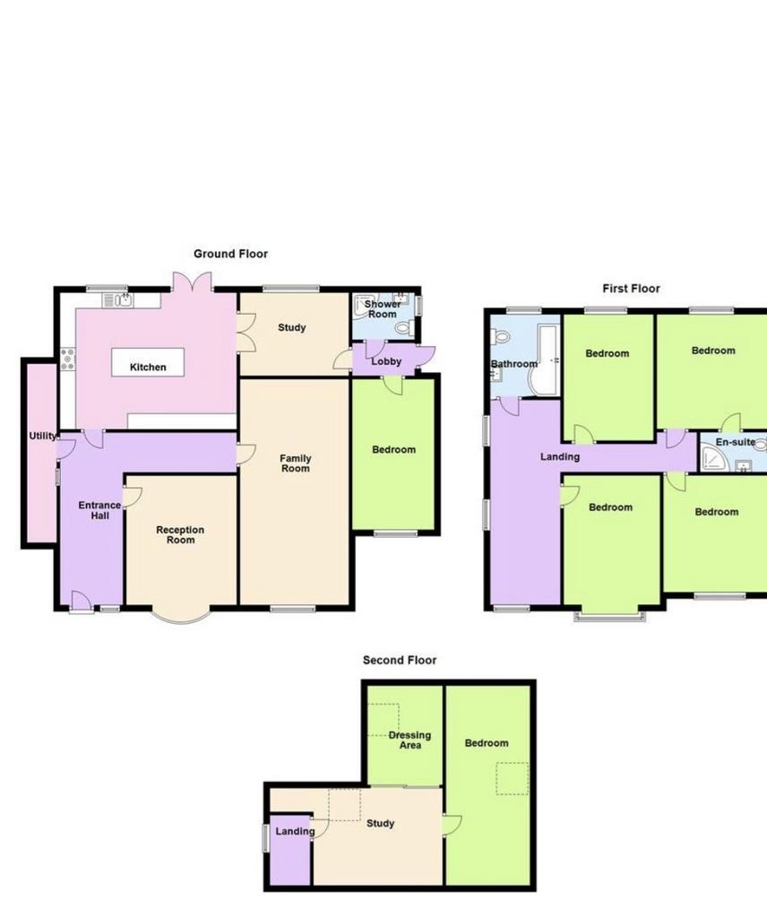 • First floor hosts four generous double bedrooms, including a principal suite with en-suite, plus a separate family bathroom