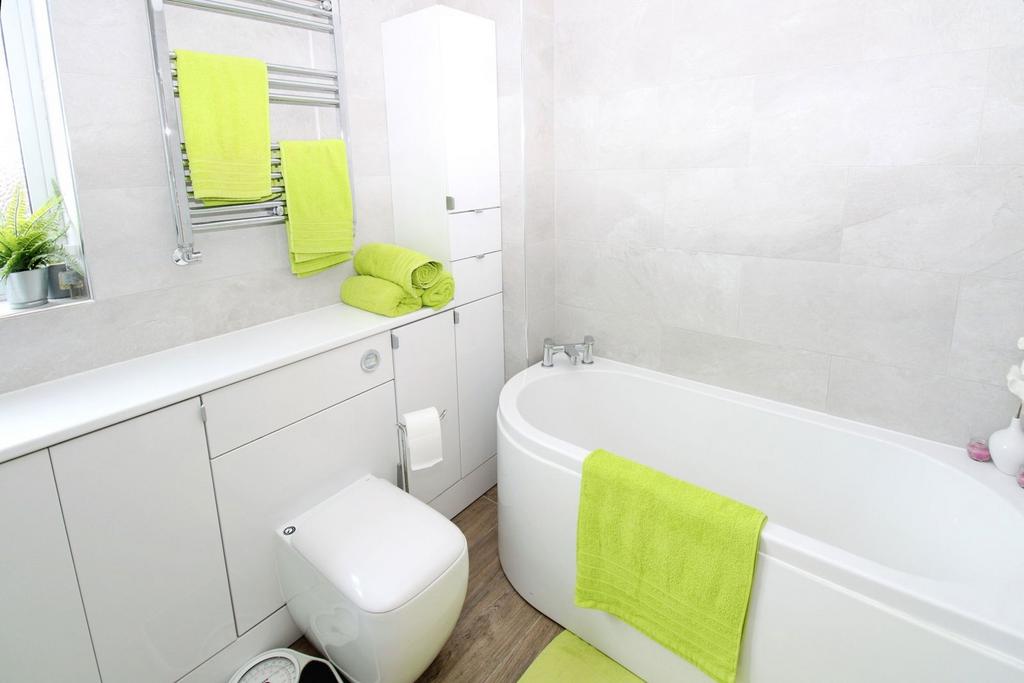 Window to side, shower cubicle with shower, wash hand basin and low level WC with vanity units, Modern roll top bath, heated towel rail