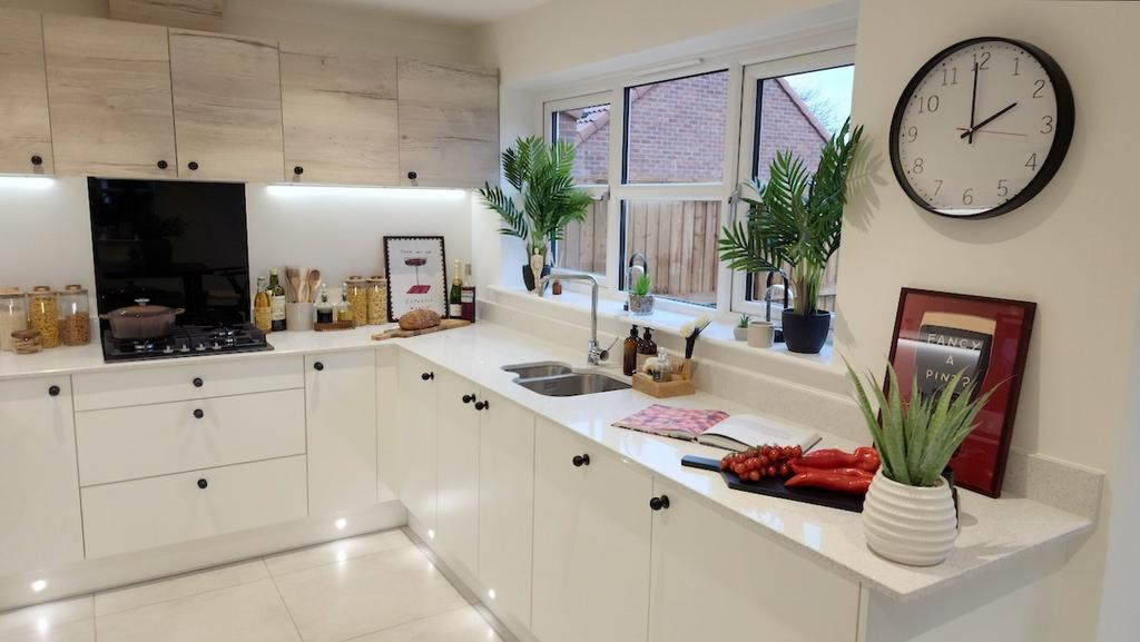 A stunningly designed four-bedroom home. Boasting a welcoming open plan kitchen with fabulous family area with French doors leading to the garden, and a separate laundry room with washer and drier space. A spacious lounge, ample cloakroom and under stairs storage completes the ground floor accommodation, with a substantial drive for parking.