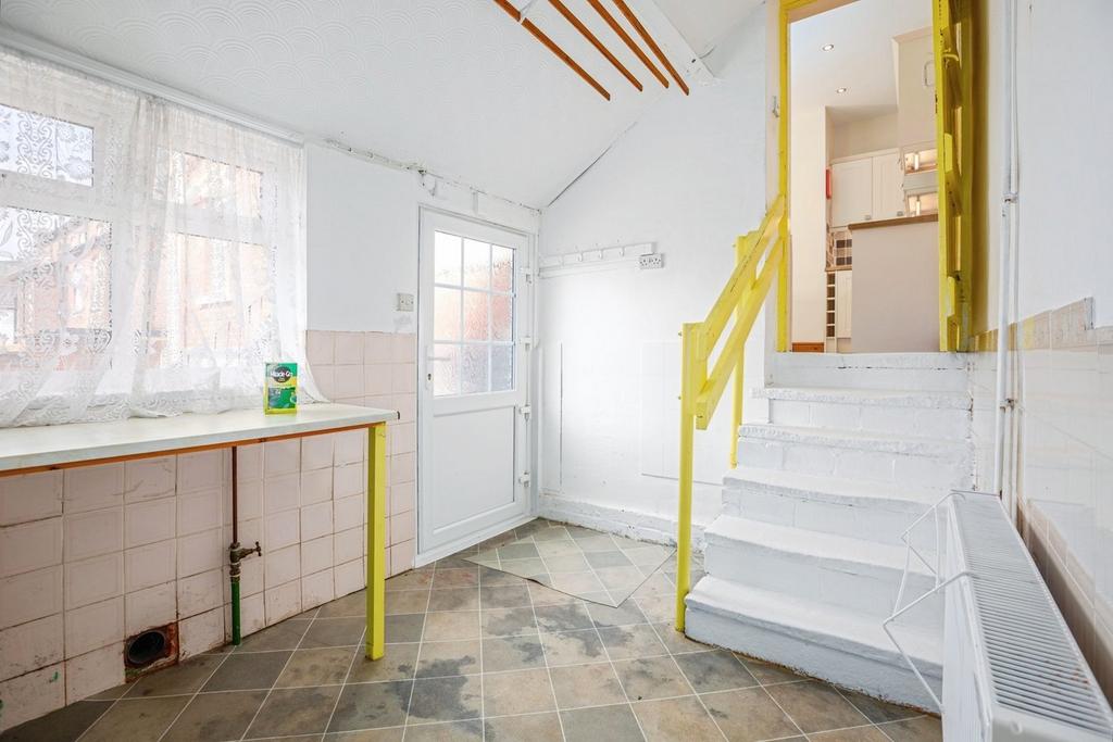The main house offers six generously sized bedrooms, including one with an en-suite shower room, and is served by two family bathrooms and a separate shower room—ideal for large or extended families. The living spaces are both expansive and refined, featuring two formal reception rooms with ornate marble-effect fireplaces, picture rails, and corniced ceilings. A bright and welcoming entrance hall with stained-glass front door sets the tone for the property’s period charm. The spacious kitchen is well-appointed with cream cabinetry, a central island, integrated appliances including a fridge, microwave, oven, 4-ring hob and dishwasher, and opens onto a rear hallway and tiled courtyard. A separate utility room and cellar with external access further enhance practicality.