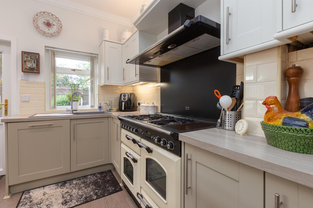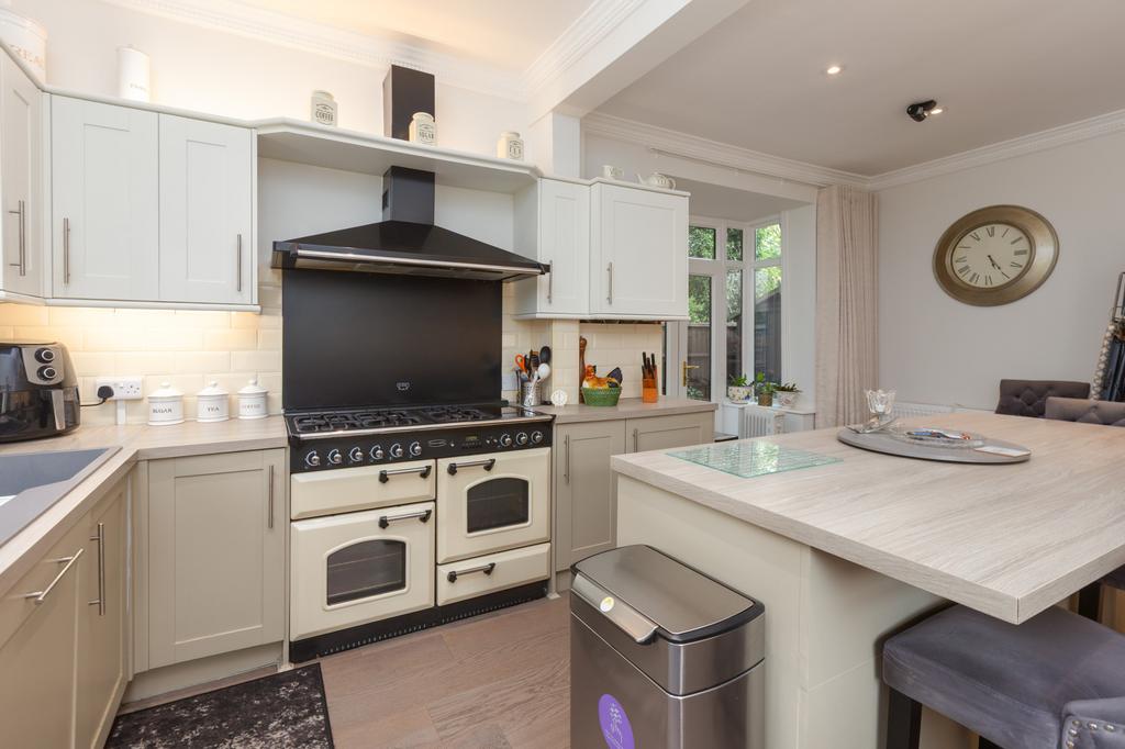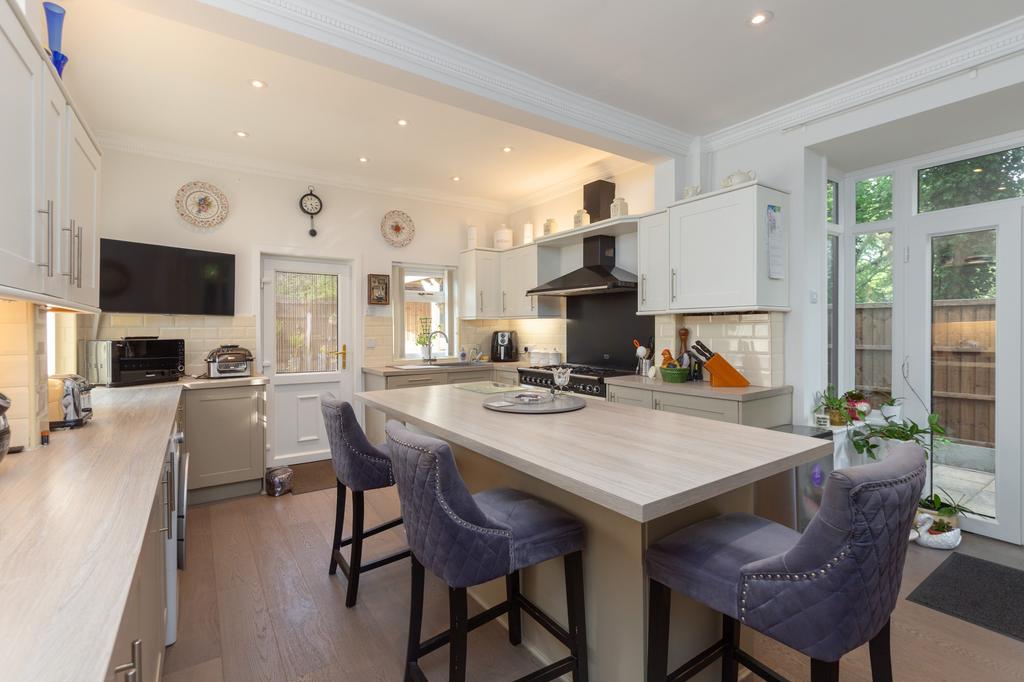 The kitchen stretches across the back of the property and is fitted with an excellent range of units, integrated appliances, and ample space for a breakfast table or island. French doors open directly onto the patio area, creating that desirable indoor-outdoor flow. A handy downstairs WC completes the ground floor.