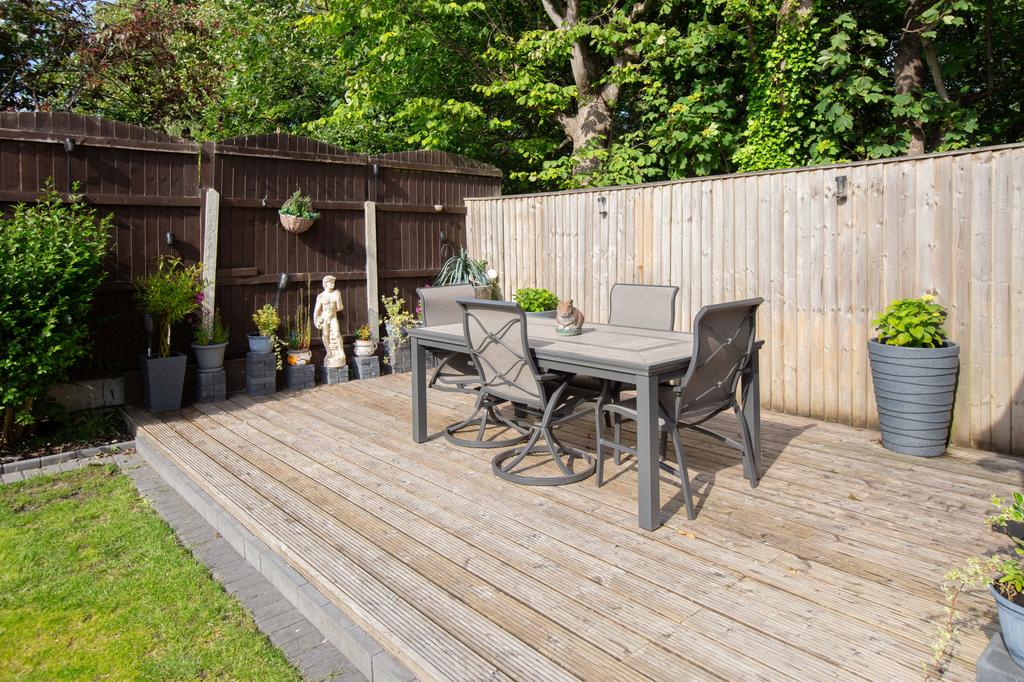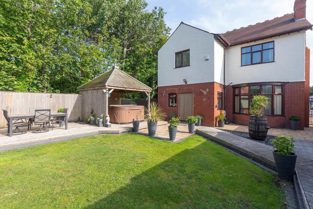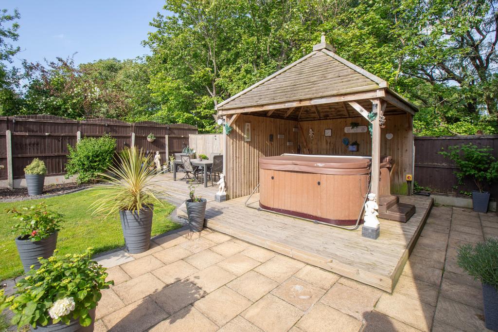But it-s the outdoor space that really sets this home apart. The rear garden has been landscaped to offer a blend of lawned areas, patio space, mature borders, and not one, but two standout features: a covered hot tub area and a bespoke outdoor bar and seating cabin—perfect for summer evenings, parties, or just relaxing in privacy. Theres also a decked dining area for al fresco meals, and decorative paving adds to the overall smart finish.
