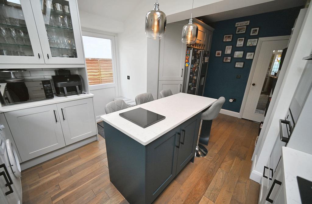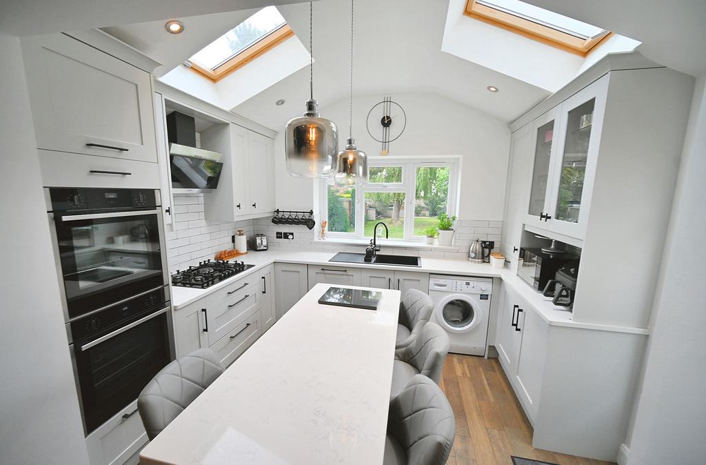 Stunning Breakfast Kitchen: 15'3'' (4.68m max) x 11'3'' (3.44m max) Fitted with a bespoke shaker style suite of light grey units comprising a range of base cupboards, drawers & suspended wall cupboards, Quartz worktops with black single drainer sink unit & matching mixer tap, central island with breakfast bar having base cupboards, built in appliances include twin Neff 'hide & slide' multi-functional double electric ovens, Hotpoint 5-ring gas hob with extractor hood over, dishwasher, plumbing for washing machine, recess for American style fridge freezer, concealed gas fired Valliant central heating boiler, vaulted ceiling with recessed ceiling spotlights & twin skylights, wood flooring, double glazed window to rear and matching PVC side door.