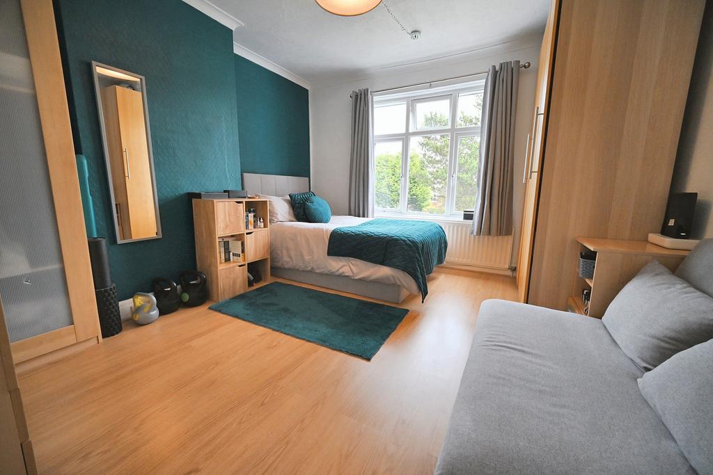 Bedroom Two: 14ft (4.26m) x 12'1'' (3.68m) Radiator, coved ceiling, laminate flooring and double glazed picture window to rear.