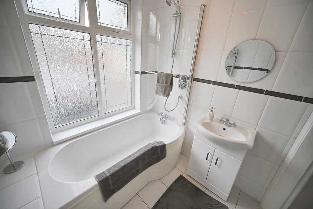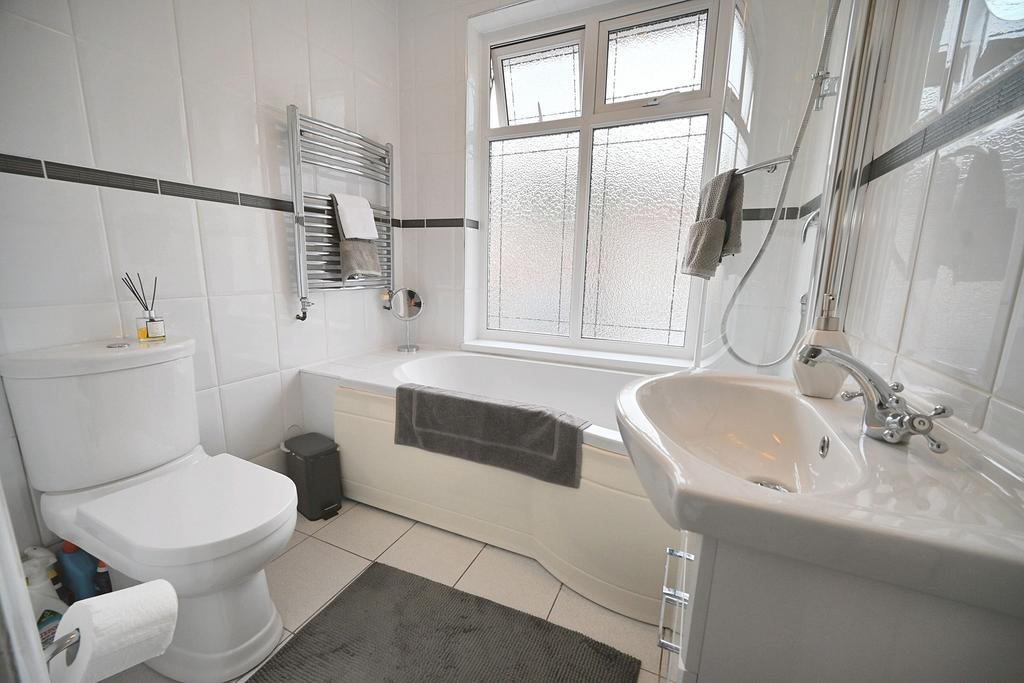 Bathroom: 6'4'' (1.93m) x 6'1'' (1.85m) Fitted with a luxury white suite comprising P-Shaped panelled bath with chrome overhead shower spray & side screen, low level WC, vanity unit, chrome heated towel rail, tiled walls & flooring and double glazed opaque window to front.