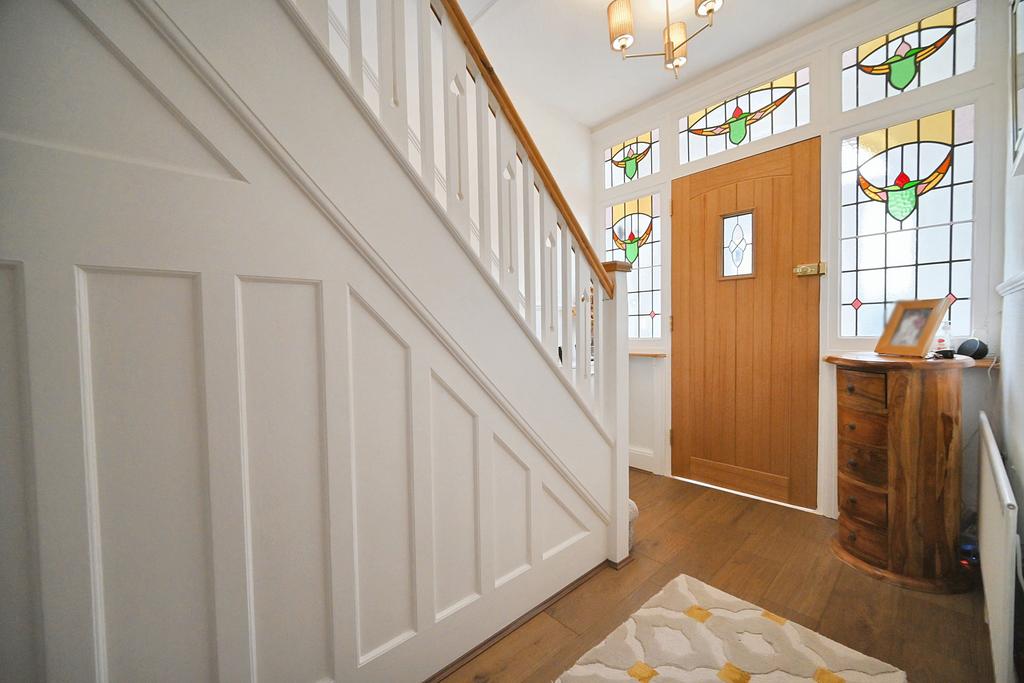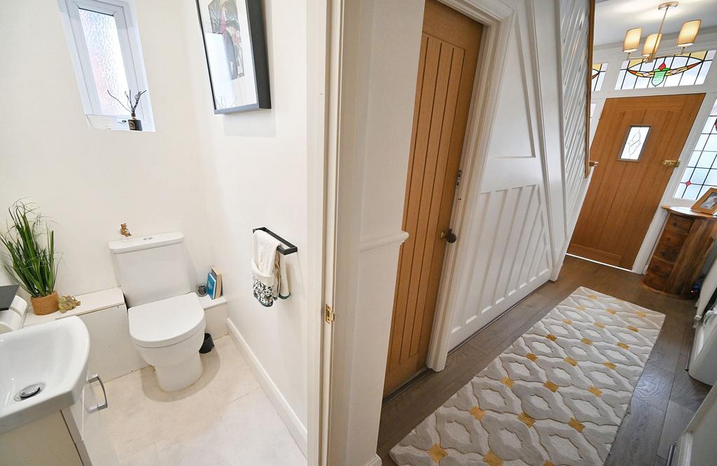 Entrance Hall: Internal hardwood door with double glazed opaque leaded window, traditional stained glass leaded opaque adjoining windows, radiator, wood flooring and L-Shaped panelled staircase to first floor with built in storage/ pantry below. Guest Cloakroom: Fitted with a white suite comprising low level WC, vanity unit, recessed ceiling spotlights, extractor fan, vinyl flooring and double glazed opaque window to side.