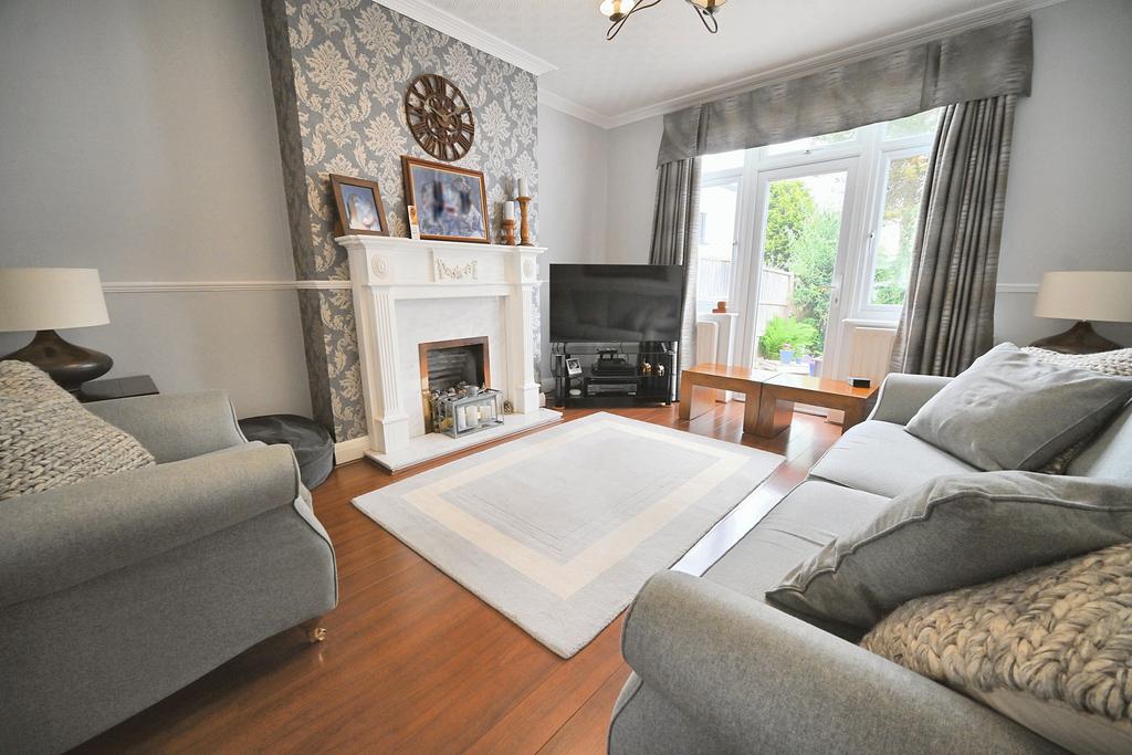 Living Room: 13'9'' (4.20m) x 11'11'' (3.63m) Marble style fireplace & hearth with decorative surround & gas coal fire, two radiators, coved ceiling, laminate flooring and double glazed picture window with door to rear garden.